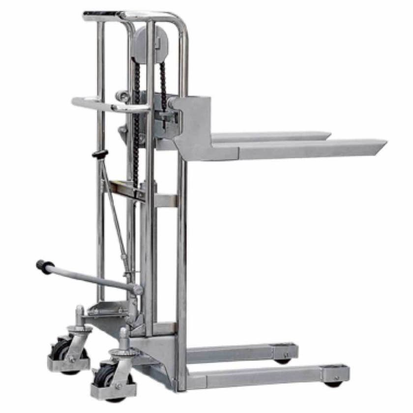 Praktisk ministaplare med manuell lyft. Utrustad med gafflar och löstagbar lastplatta, som gör att Du kan använda staplaren som ett mobilt lyftbord. Fällbar pumpstång och vridhandtag för sänkning. Försedd med överlastningsventil, underhållsfria bussningar och lager (RS). Fotbromsar på de bakre hjulen.