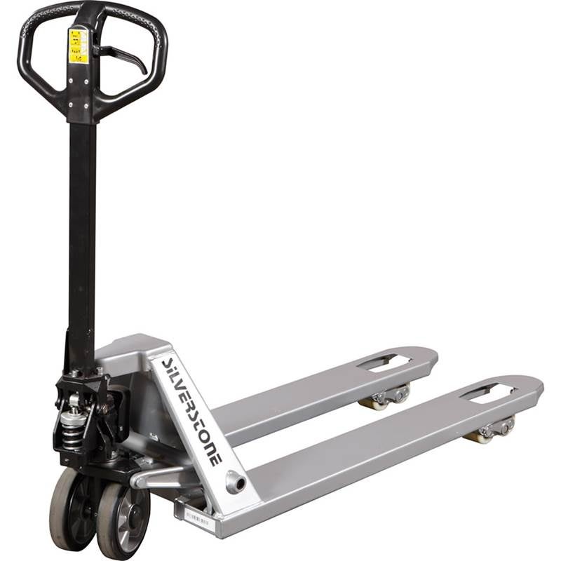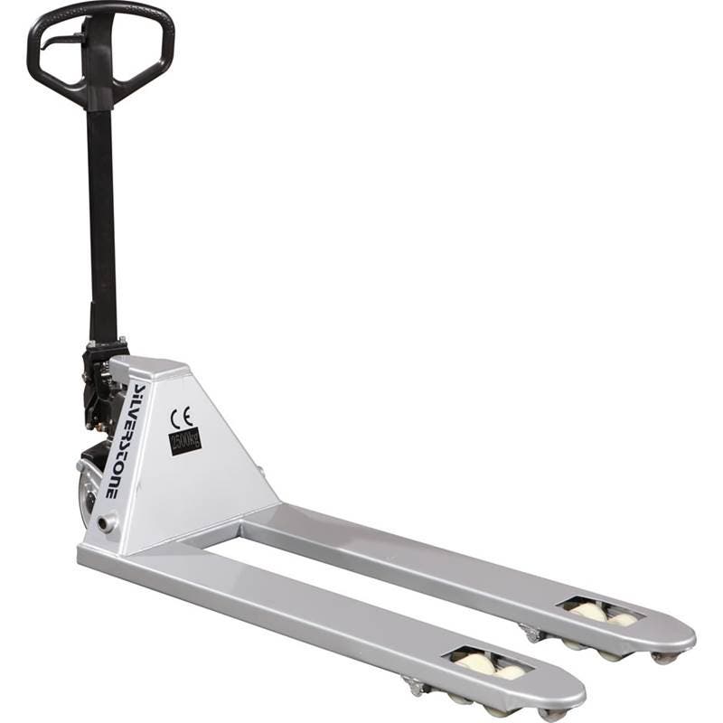 Gaffellyftvagn där Du lyfter pallen redan på ett pumptag. Med 230° styrvinkel får Du en enkel hantering i trånga utrymmen. Kolvar, packningar och hydraulpaket av högsta kvalitet från Tyskland. Hydraulsystemet är försett med överströmningsventil, som garanterar att överbelastning inte kan ske. Detta ger en lång livslängd och låga servicekostnader. Smörjfria lager och bussningar. Bredd över gafflar 540 mm, styrhjul 200x50 mm, gaffelhjul 80x65 mm. Gummihjul på styrhjul. Silverfärgad. 3 års garanti på pumpen.