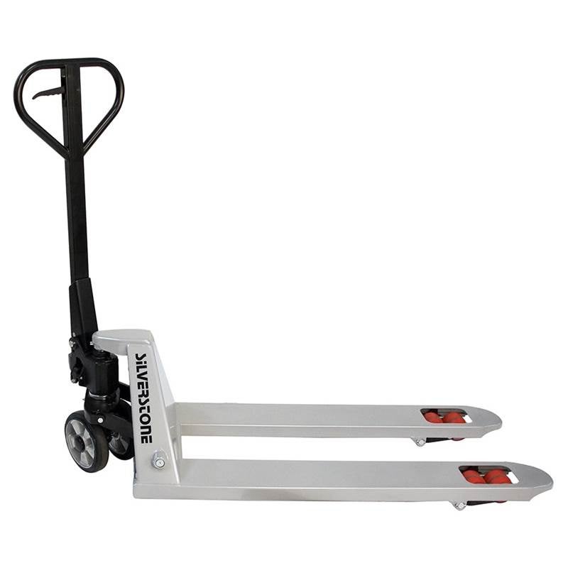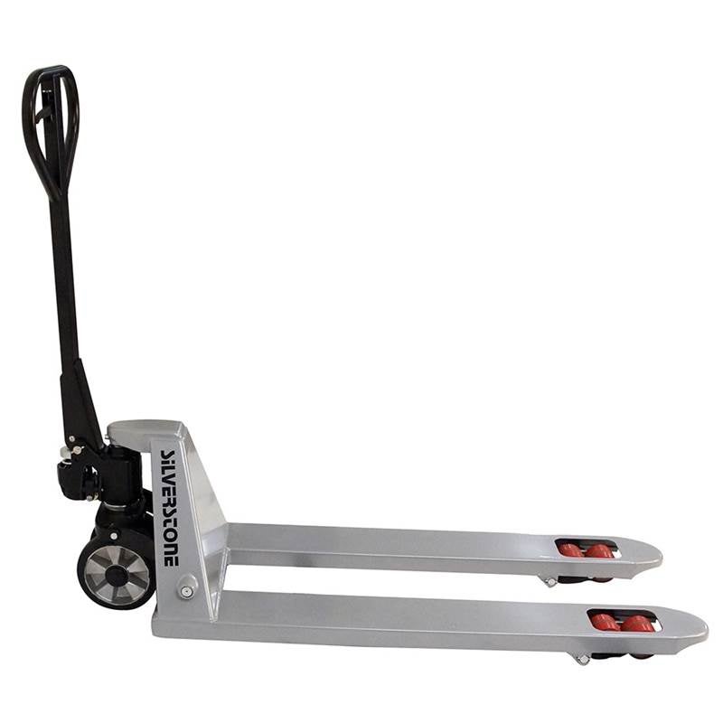 Gaffellyftvagn där Du lyfter pallen redan på ett pumptag. Med 230° styrvinkel får Du en enkel hantering i trånga utrymmen. Kolvar, packningar och hydraulpaket av högsta kvalitet från Tyskland. Hydraulsystemet är försett med överströmningsventil, som garanterar att överbelastning inte kan ske. Detta ger en lång livslängd och låga servicekostnader. Smörjfria lager och bussningar. Bredd över gafflar 540 mm, styrhjul 200x50 mm, gaffelhjul 80x65 mm. Gummihjul på styrhjul. Silverfärgad. 3 års garanti på pumpen.