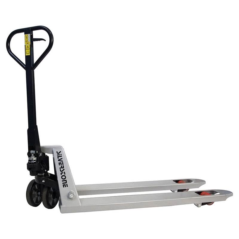 Gaffellyftvagn där Du lyfter pallen redan på ett pumptag. Med 230° styrvinkel får Du en enkel hantering i trånga utrymmen. Kolvar, packningar och hydraulpaket av högsta kvalitet från Tyskland. Hydraulsystemet är försett med överströmningsventil, som garanterar att överbelastning inte kan ske. Detta ger en lång livslängd och låga servicekostnader. Smörjfria lager och bussningar. Bredd över gafflar 540 mm, styrhjul 200x50 mm, gaffelhjul 80x65 mm. Gummihjul på styrhjul. Silverfärgad. 3 års garanti på pumpen.