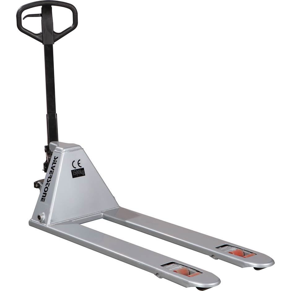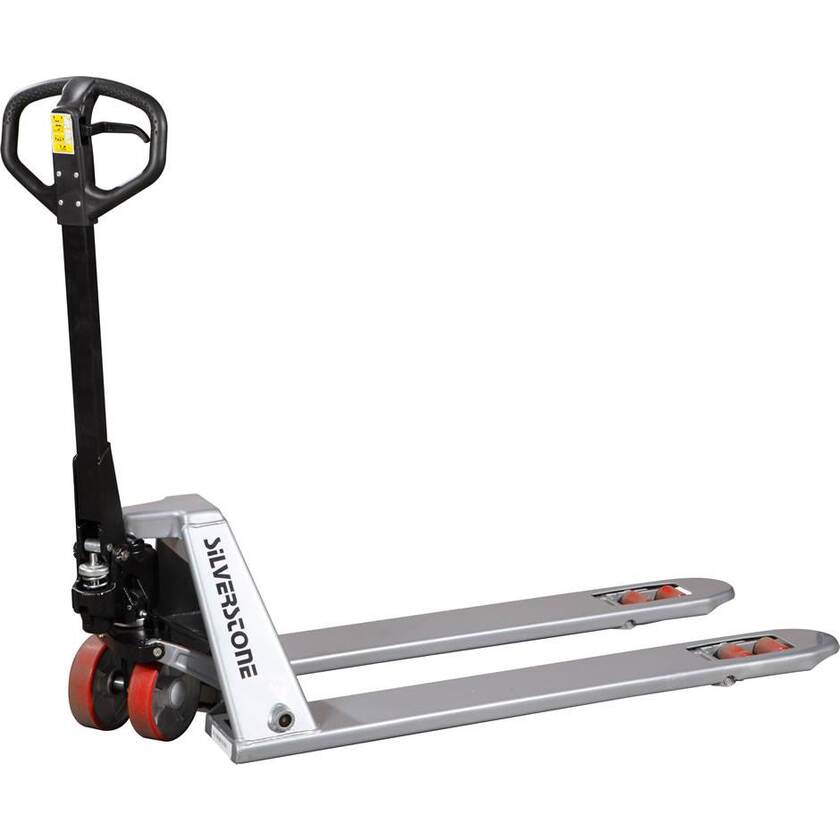 Gaffellyftvagn där Du lyfter pallen redan på ett pumptag. Lågprofil, extra låga gafflar. Med 230° styrvinkel får Du en enkel hantering i trånga utrymmen. Kolvar, packningar och hydraulpaket av högsta kvalitet från Tyskland. Hydraulsystemet är försett med överströmningsventil, som garanterar att överbelastning inte kan ske. Detta ger en lång livslängd och låga servicekostnader. Smörjfria lager och bussningar. Bredd över gafflar 540 mm, styrhjul PU, gaffelhjul: Boogie PU