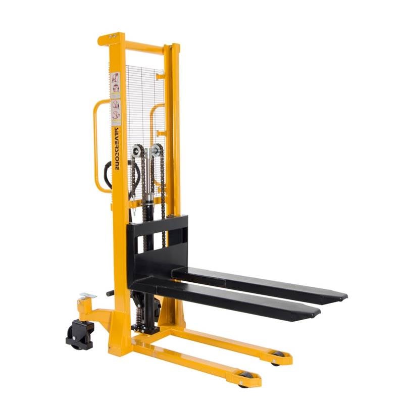 Manuell staplare med ett svetsat och förstärkt chassi för tunga laster. 1-stegs eller 2-stegs lyftstativ gjort av C-sektionsprofiler, dubbla kedjor och singel lyftcylinder, gaffelvagn och hjul.