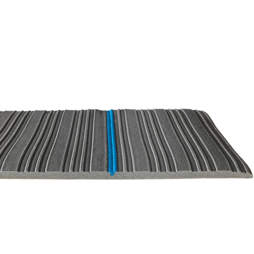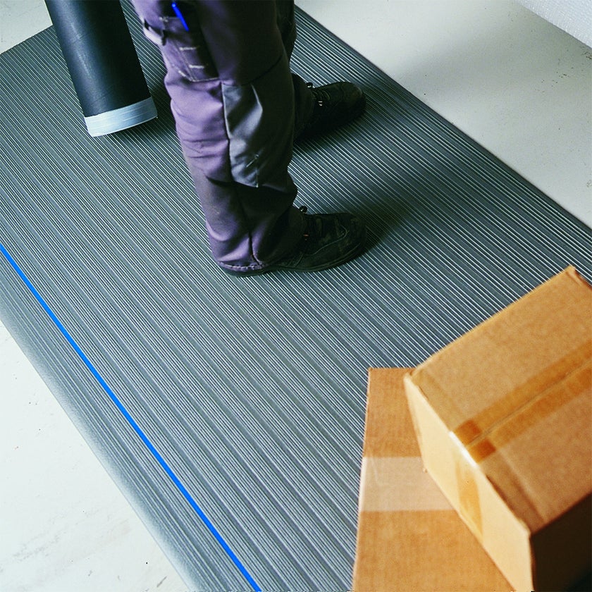 Klassisk arbetsplatsmatta av vinyl med slutna celler och hög densitet för torra, lättare industrimiljöer. Ribbmönstrat ytskikt för halkskydd och fasade kanter för låg snubbelrisk. Finns i tre bredder som säljs i hela löpmeter eller i rullar om 18,3 meter. Mattan är grå med blå markeringslinje. Bredder: 610 mm, 91 0mm och 1220 mm.