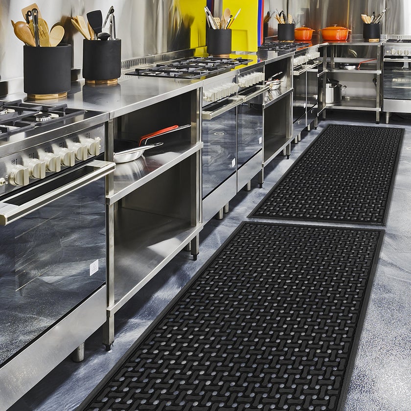 Comfort Flow är en mjuk och avlastande arbetsplatsmatta som ger bra komfort och ergonomi på hårda golv. Det kraftiga mönstret gör den halksäker och den öppna konstruktionen släpper igenom och dränerar väta samt ventilerar golvet.