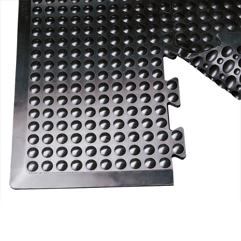 Arbetsplatsmatta tillverkad i naturgummi, vilket ger en mjuk och spänstig matta för bästa ergonomi. De runda bubblorna på ovansidan stimulerar fötterna, ökar blodcirkulationen och Du mår bättre i både ben och fötter. "Flex" bygger på ett modulsystem med änd- och mittbitar, som gör att Du kan bygga önskad längd på mattan. Modulerna har snedfasade kanter för minskad snubbelrisk och är lätta att ta isär för rengöring. Mattan lämpar sig väl även vid låga temperaturer, eftersom naturgummit behåller sin smidighet även vid minusgrader. Den tål väta, men passar bäst i torrare miljöer utan kemikaliepåverkan. Tjocklek 13 mm, färg svart. Finns även i fast storlek 600 x 900 mm.