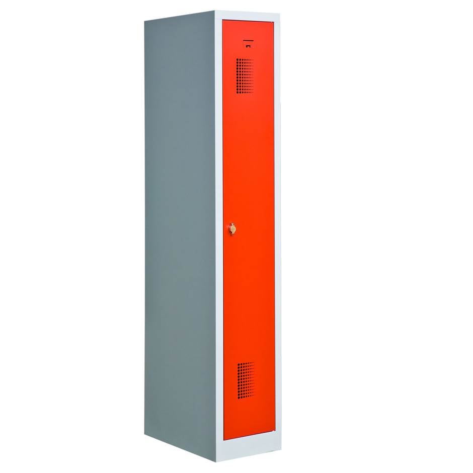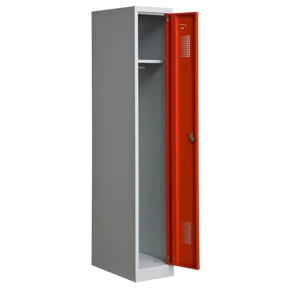 Klädskåp med sockel, 1 x 300 mm, B:300 x D:550 x H:1800 mm, för arbetsplatser, skolor, sjukhus, idrottshallar, kontor, butiker mm. Totalhöjd 1800 mm, sockelns höjd 80 mm. Levereras med klinka för hänglås, men kan även fås med cylinderlås. Inredningen i klädskåpet består av hatthylla och klädstång med ankarkrokar. Som standard levereras klädskåpet med plant tak, men kan även fås med sluttande tak, förberett för ventilationsrör samt perforerad botten och hatthylla. Kontakta oss för prisförslag. Ljusgrå stomme, dörr i färgerna röd eller ljusblå. Skåpet finns även med benstativ samt benstativ med sittbänk.