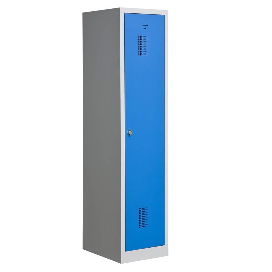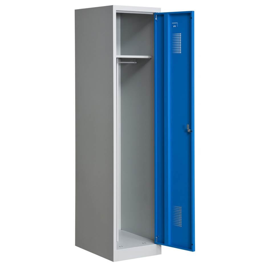 Klädskåp med sockel, 1 x 400 mm, B:400 x D:550 x H:1800 mm, för arbetsplatser, skolor, sjukhus, idrottshallar, kontor, butiker mm. Totalhöjd 1800 mm, sockelns höjd 80 mm. Levereras med klinka för hänglås, men kan även fås med cylinderlås. Inredningen i klädskåpet består av hatthylla och klädstång med ankarkrokar. Skiljevägg finns som tillbehör. Som standard levereras klädskåpet med plant tak, men kan även fås med sluttande tak, förberett för ventilationsrör samt perforerad botten och hatthylla. Ljusgrå stomme, dörr i färgerna röd eller ljusblå. Skåpet finns även med benstativ samt benstativ med sittbänk.