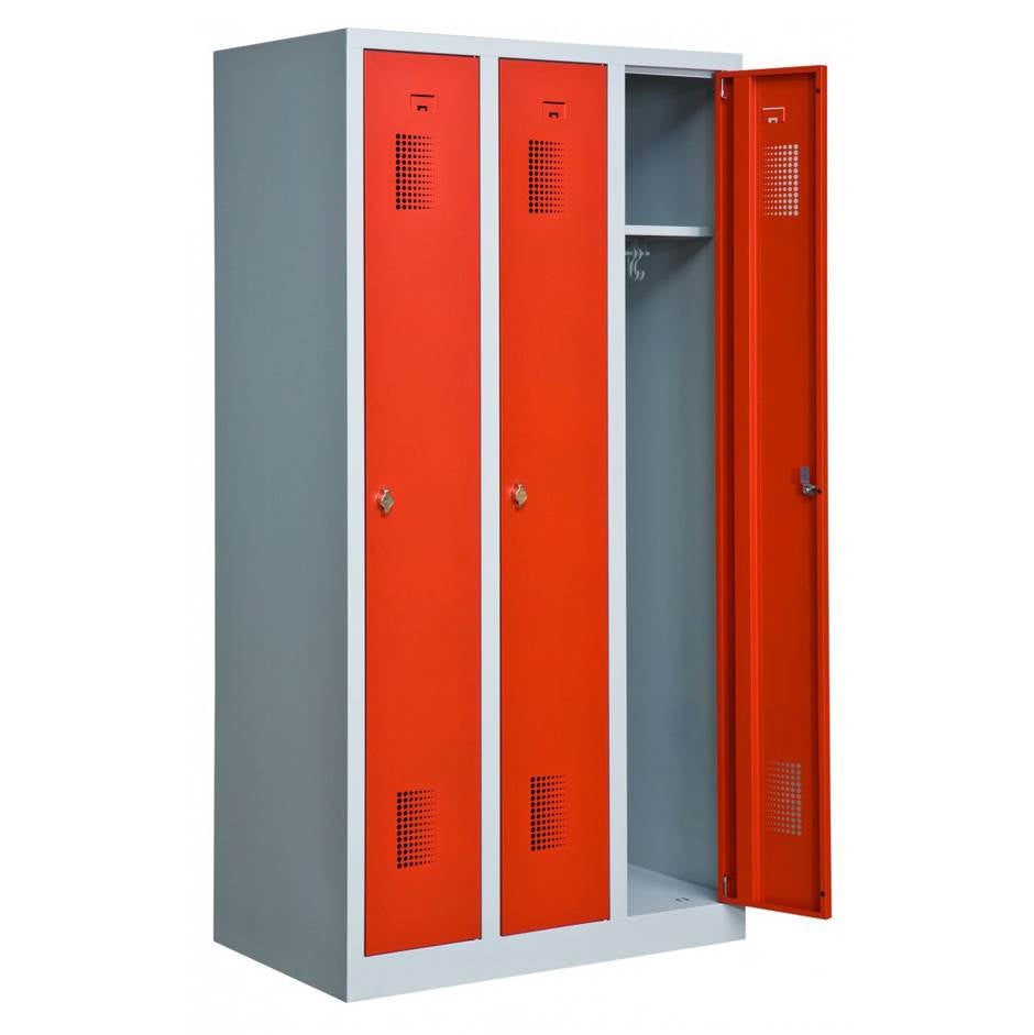 Klädskåp med sockel, färdigmonterad sektion 3 x 300 mm, B:900 x D:550 x H:1800 mm, för arbetsplatser, skolor, sjukhus, idrottshallar, kontor, butiker mm. Totalhöjd 1800 mm, sockelns höjd 80 mm. Levereras med klinka för hänglås, men kan även fås med cylinderlås. Inredningen i klädskåpen består av hatthylla och klädstång med ankarkrokar. Som standard levereras klädskåpen med plant tak, men kan även fås med sluttande tak, förberett för ventilationsrör samt perforerad botten och hatthylla. Kontakta oss för prisförslag. Ljusgrå stomme, dörr i färgerna röd eller ljusblå. Skåpen finns även med benstativ samt benstativ med sittbänk.