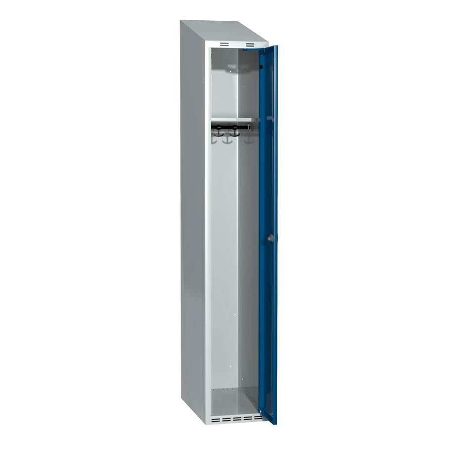 Klädskåp av stål, med sluttande tak. Inrett med hatthylla och klädstång med två st ankarkrokar samt en handduksknopp på dörrens insida. Skåpet är ventilerat med lufthål i botten samt i ovankant framsida. Som standard kommer skåpet med stomme Grå RAL7035. Dörren är valbar i Blå RAL5010, Grå RAL7035 eller Svart RAL9005. Ytterligare färgalternativ finns att få vid förfrågan. Som standard är skåpet försett med klinka.