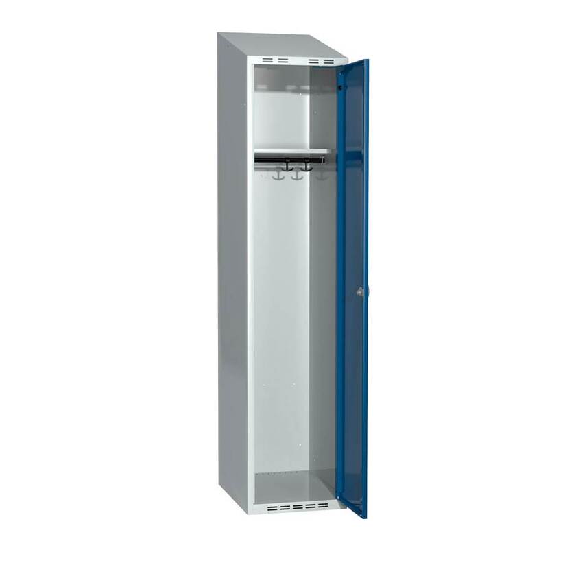 Klädskåp av stål, med sluttande tak. Skåpet är inrett med hatthylla och klädstång med två st ankarkrokar samt en handduksknopp på dörrens insida. Skåpet är ventilerat med lufthål i botten samt i ovankant framsida. Som standard kommer skåpet med stomme Grå RAL7035. Dörrar är valbara i Blå RAL5010, Grå RAL7035 eller Svart RAL9005. Ytterligare färgalternativ finns att få vid förfrågan. Som standard är skåpet försett med klinka.