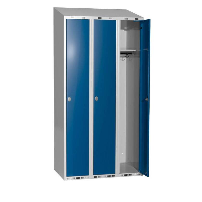 Klädskåp av stål, med sluttande tak. 3st 300 mm skåp i bredd. Varje skåp inrett med hatthylla och klädstång med två st ankarkrokar samt en handduksknopp på dörrens insida. Skåpet är ventilerat med lufthål i botten samt i ovankant framsida. Som standard kommer skåpet med stomme Grå RAL7035. Dörrar är valbara i Blå RAL5010, Grå RAL7035 eller Svart RAL9005. Ytterligare färgalternativ finns att få vid förfrågan. Som standard är skåpet försett med klinka.