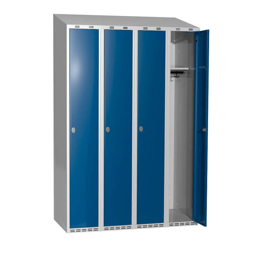 Klädskåp av stål, med sluttande tak. 4st 300 mm skåp i bredd. Varje skåp inrett med hatthylla och klädstång med två st ankarkrokar samt en handduksknopp på dörrens insida. Skåpet är ventilerat med lufthål i botten samt i ovankant framsida. Som standard kommer skåpet med stomme Grå RAL7035. Dörrar är valbara i Blå RAL5010, Grå RAL7035 eller Svart RAL9005. Ytterligare färgalternativ finns att få vid förfrågan. Som standard är skåpet försett med klinka.