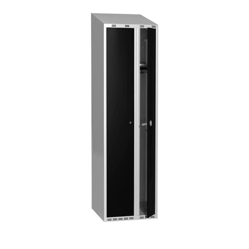 Parskåp med sluttande tak. Skåpbredd vänster skåp: 300 mm, höger skåp: 200 mm. Ventilationsslitsar över och under dörr samt ventilerad botten. Inredning i vänster skåp - hatthylla samt klädstång med två ankarkrokar. Inredning i höger skåp: hatthylla samt klädstång med en ankarkrok. Som standard kommer skåpet med stomme Grå RAL7035. Dörrar är valbara i Blå RAL5010, Grå RAL7035 eller Svart RAL9005. Ytterligare färgalternativ finns att få vid förfrågan. Som standard är skåpet försett med klinka.