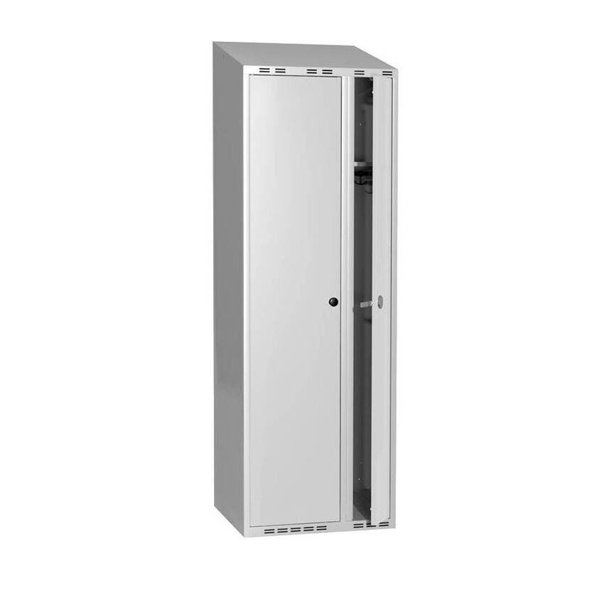 Parskåp med sluttande tak. Skåpbredd vänster skåp: 400 mm, höger skåp: 200 mm. Ventilationsslitsar över och under dörr samt ventilerad botten. Inredning i vänster skåp - hatthylla samt klädstång med två ankarkrokar. Inredning i höger skåp: hatthylla samt klädstång med en ankarkrok. Som standard kommer skåpet med stomme Grå RAL7035. Dörrar är valbara i Blå RAL5010, Grå RAL7035 eller Svart RAL9005. Ytterligare färgalternativ finns att få vid förfrågan. Som standard är skåpet försett med klinka.