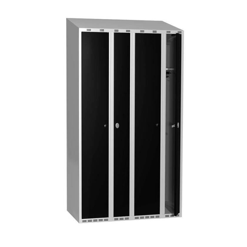 Dubbelt parskåp med sluttande tak. Skåpbredd vänster skåp: 300 mm, höger skåp: 200 mm. Ventilationsslitsar över och under dörr samt ventilerad botten. Inredning i vänster skåp - hatthylla samt klädstång med två ankarkrokar. Inredning i höger skåp: hatthylla samt klädstång med en ankarkrok. Som standard kommer skåpet med stomme Grå RAL7035. Dörrar är valbara i Blå RAL5010, Grå RAL7035 eller Svart RAL9005. Ytterligare färgalternativ finns att få vid förfrågan. Som standard är skåpet försett med klinka.