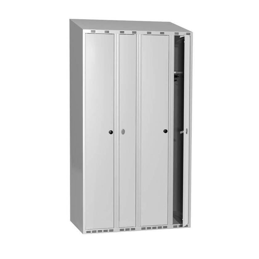 Dubbelt parskåp med sluttande tak. Skåpbredd vänster skåp: 300 mm, höger skåp: 200 mm. Ventilationsslitsar över och under dörr samt ventilerad botten. Inredning i vänster skåp - hatthylla samt klädstång med två ankarkrokar. Inredning i höger skåp: hatthylla samt klädstång med en ankarkrok. Som standard kommer skåpet med stomme Grå RAL7035. Dörrar är valbara i Blå RAL5010, Grå RAL7035 eller Svart RAL9005. Ytterligare färgalternativ finns att få vid förfrågan. Som standard är skåpet försett med klinka.