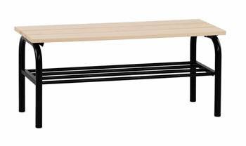 Fristående omklädningsbänk, för t.ex. personalutrymmen, sporthallar, gymnastiksalar och skolor. Kraftiga ståldetaljer pulverlackerade i silvergrå (RAL 9006) eller svart (RAL 9005) färg. Trädetaljer i massiv, klarlackad furu.