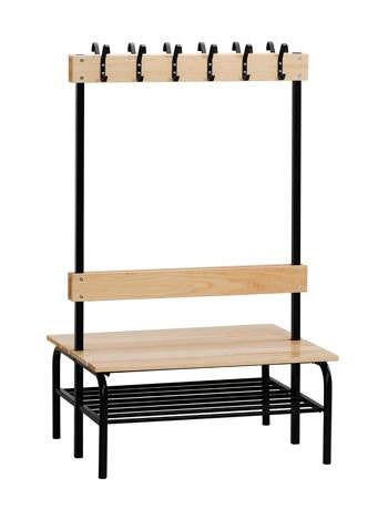 Dubbelsidig omklädningsbänk för t.ex. personalutrymmen, sporthallar, gymnastiksalar och skolor. Kraftiga ståldetaljer och krokar pulverlackerade i silvergrå (RAL 9006) eller svart (RAL 9005) färg. Trädetaljer i massiv, klarlackad furu.
