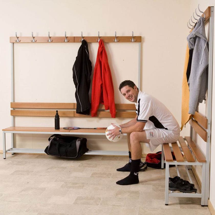Omklädningsbänk med ryggstöd, kroklist och skohylla, längd 1500 mm