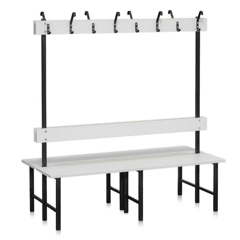 En stabil sittbänk i dubbelsektion med ryggbräda och kroklist för till exempel omklädningsrum. Sitthöjd 430 mm och sittdjup på 365 mm. Totalhöjd 1600 mm. Pulverlackerat underrede i svart.