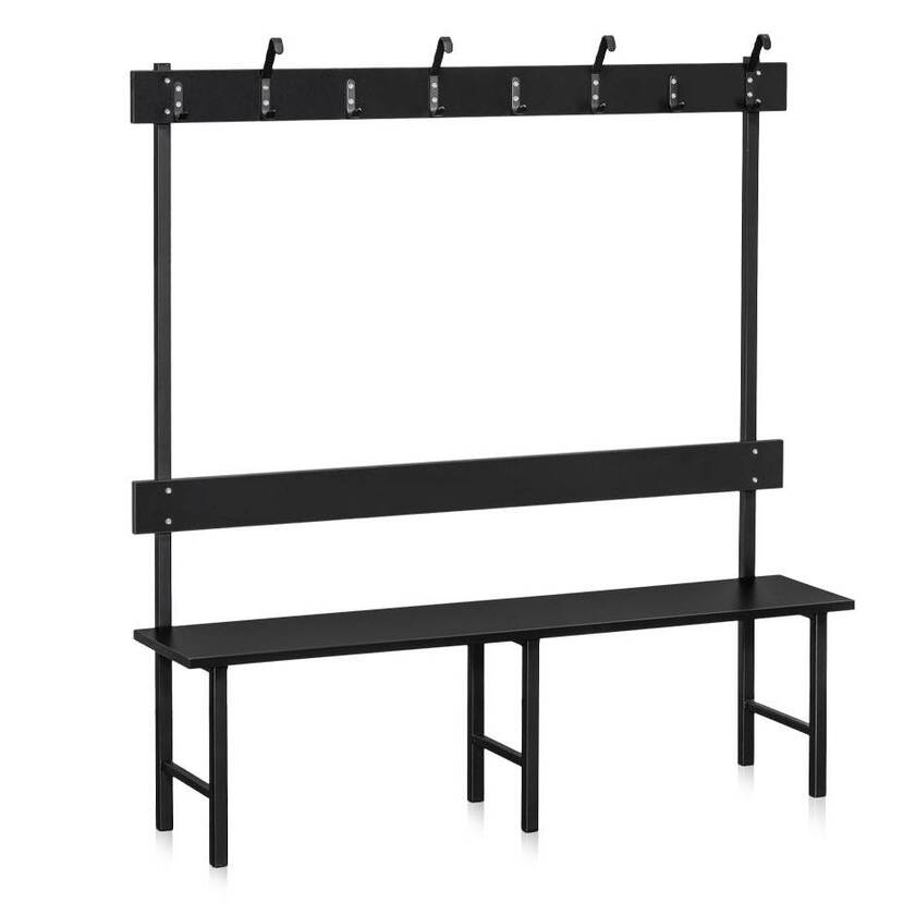 En stabil, enkelsidig fristående sittbänk med ryggbräda och kroklist för till exempel omklädningsrum. Sitthöjd 430 mm och sittdjup på 365 mm. Totalhöjd 1600 mm. Pulverlackerat underrede i svart.