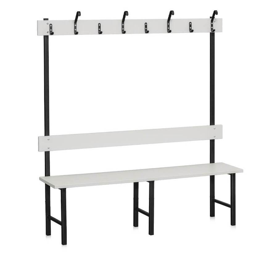 En stabil, enkelsidig fristående sittbänk med ryggbräda och kroklist för till exempel omklädningsrum. Sitthöjd 430 mm och sittdjup på 365 mm. Totalhöjd 1600 mm. Pulverlackerat underrede i svart.
