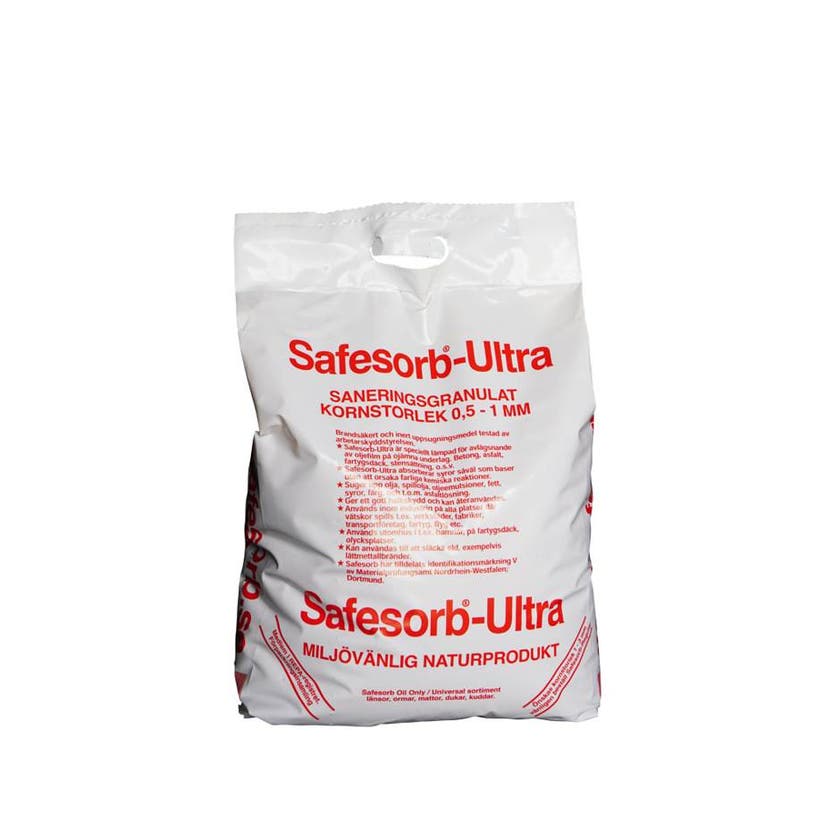 Granulat för både inom- och utomhusbruk. Snabb absorption på vägbanor, hårda och fasta arbetsytor. Tillverkat av kalcinerad Diatomit och därför kemiskt inert. Safesorb Ultra kapslar in vätskan och behåller sin hårdhet även vid mättnad, därav en halksäker produkt. Lämplig till alla typer av vätskor. Safesorb Ultra har en granulatstorlek på 0,5 - 1,0 mm, (finkornig), detta gör att produkten har en speciell förmåga att komma ner i ojämnheter och sprickor i t.ex. asfalt och betongbeläggningar. 84x10kg/pall.