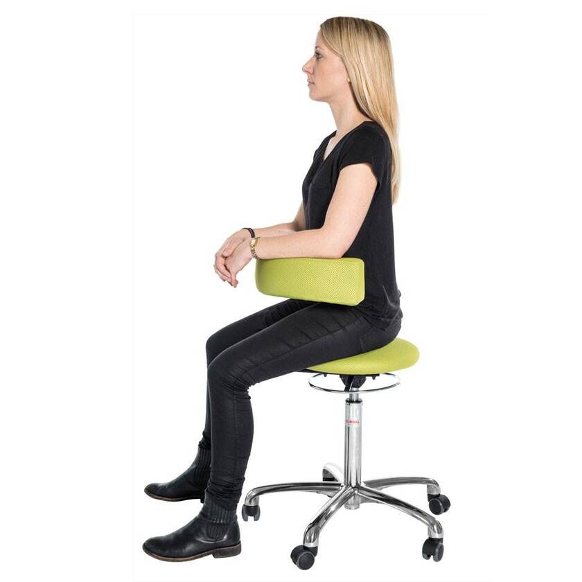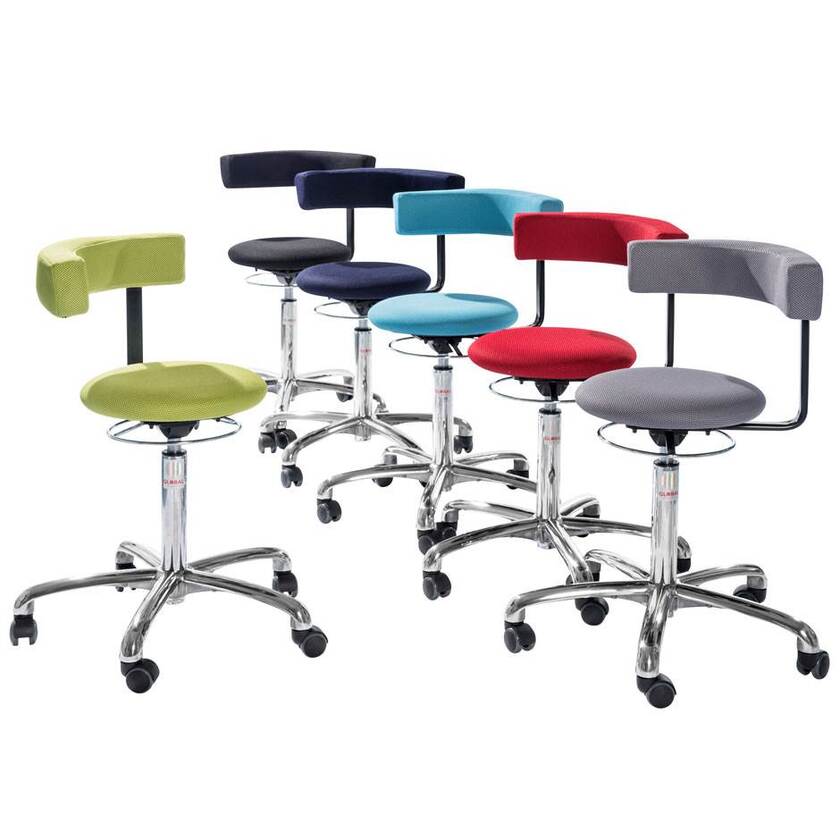 När man sitter på Saturnstolen så är det väldigt enkelt att ändra sittställning. Det kombinerade rygg/armstödet kan roteras 360°. Denna flexibla lösning inbjuder till skiftande arbetsställning under en arbetsdag. Sitsen är stoppad med 30 mm kallskum och är klädd med tyg, som ger en behaglig sittkomfort. Tyget är valbart i 5 olika kulörer. Höjdjusteringen regleras med en ringutlösare under sitsen. Sits diameter: 360 mm.
