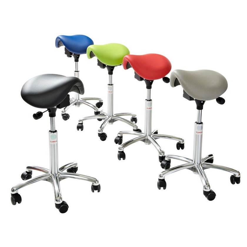 Sadelstol Mini. Ytterst bekväm och ergonomiskt sittriktig. Aluminiumskryss med lättrullade hjul. Välj mellan sitthöjd 480-610 mm eller 580-770 mm. Klädd i konstläder valbar i 5 färger, alternativt tyg i samma nyanser. Utrustad med Easy Seat sitsmekanik som möjliggör vinkling 5° bakåt till 12° framåt.