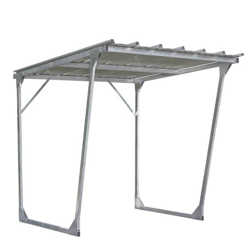 Ett cykelgarage för cyklar, mopeder mm. Plats för upp till 5 cyklar. Konstruktionen består av korrugerat tak och stommen i galvaniserat stål med öppna sidor. Kan fästas i marken för extra stabilitet. Levereras omonterad. Detta är en bassektion som kan byggas på med andra tillbehör så som bak- och sidopaneler för att få ett bättre väderskydd.