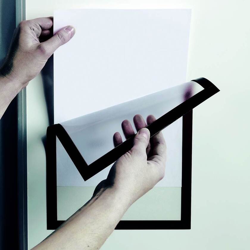 Smidig magnetram i A4-format. Transparent front och magnetisk kantram i färgerna silvergrå eller svart. Fäster på släta, magnetiska ytor som whiteboards, pallstallage, lagerhyllor, maskiner etc. Du byter lätt ut budskapet och ramen lämnar inga märken.