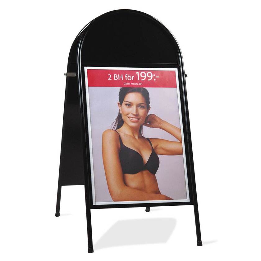 Klassiskt skyltställ Visa där Du lätt byter budskap och som är smidigt att flytta. Budskapet appliceras enkelt med hjälp av magnetförsedd, UV-beständig frontplast.