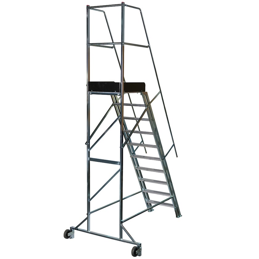 Vår trappa med lejdare ger dig en trygg och stabil arbetsplattform ovan mark. Stommen är tillverkad av förzinkat stål medan plattform och steg består av räfflade aluminiumprofiler. Trappan står stadigt på två klossar och kan enkelt flyttas genom att lyfta framdelen så att den rullar på sina gummihjul. Levereras i hopfällt skick, kan enkelt monteras och demonteras med ett fåtal bultar.