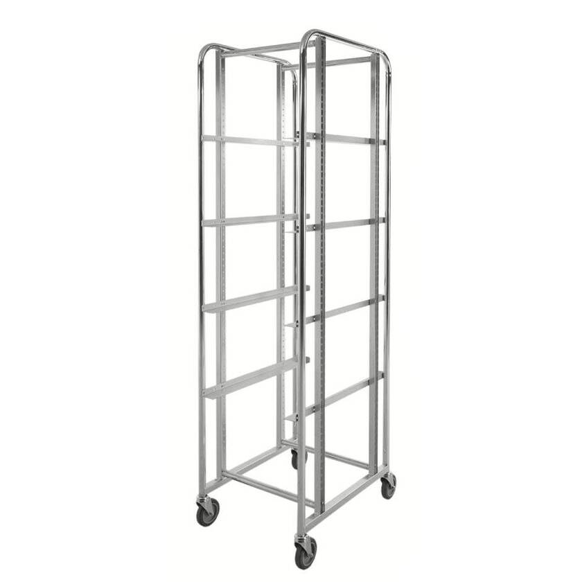 Helsvetsad backvagn med 25 mm elförzinkade rör. Stativet kan utrustas med valfritt antal backskenor eller hyllor, dessa finns som tillval under tillbehör. Skenorna och hyllorna kan monteras horisontellt 16, 30 och 40 grader, totalt finns 63 st hål. Backvagnen är anpassad för plastbackar 600 x 400 mm. Stativet är utrustad med 4 st svängbara Ø100 mm gummihjul. Backvagnen är valbar med eller utan broms. Kapacitet 150 kg.