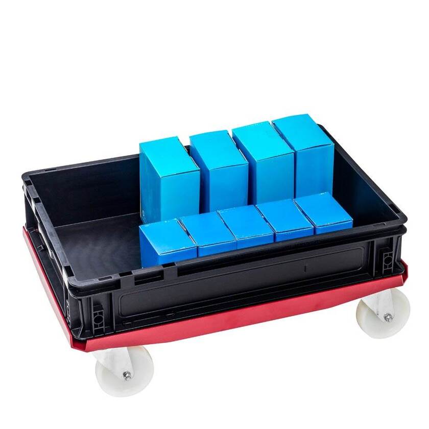 Tralla Hugo, L615 x B415 x H170 mm, kapacitet 200 kg, 4 länkhjul, vinröd