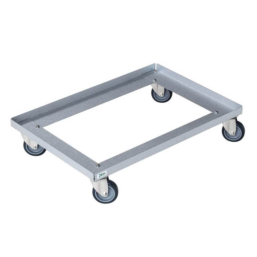 Tralla Scott i alu/zink. med standardmått, L616 x B416 x H128 mm, perfekt för backar. Enkelt utförande med öppna hörn. Öppen botten med bred kant. Trallan är utrustad med 4 tystgående länkhjul Ø 75 mm. Önskar du utrusta din tralla med 2 fasta hjul och 2 länkhjul så är det valbart i rullisten nedan. Maxbelastning 100 kg. Vikt 3 kg.