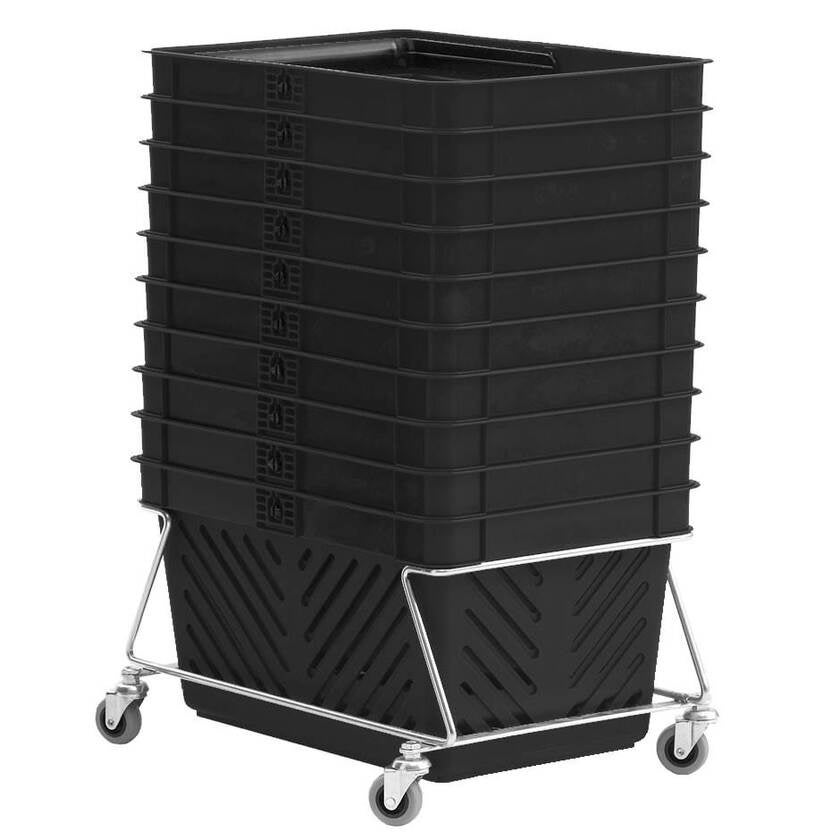 Stabil och staplingsbar butikskorg med greppvänligt handtag. Tillhörande vagnar för smidig förflyttning och förvaring. Levereras i 12 pack.