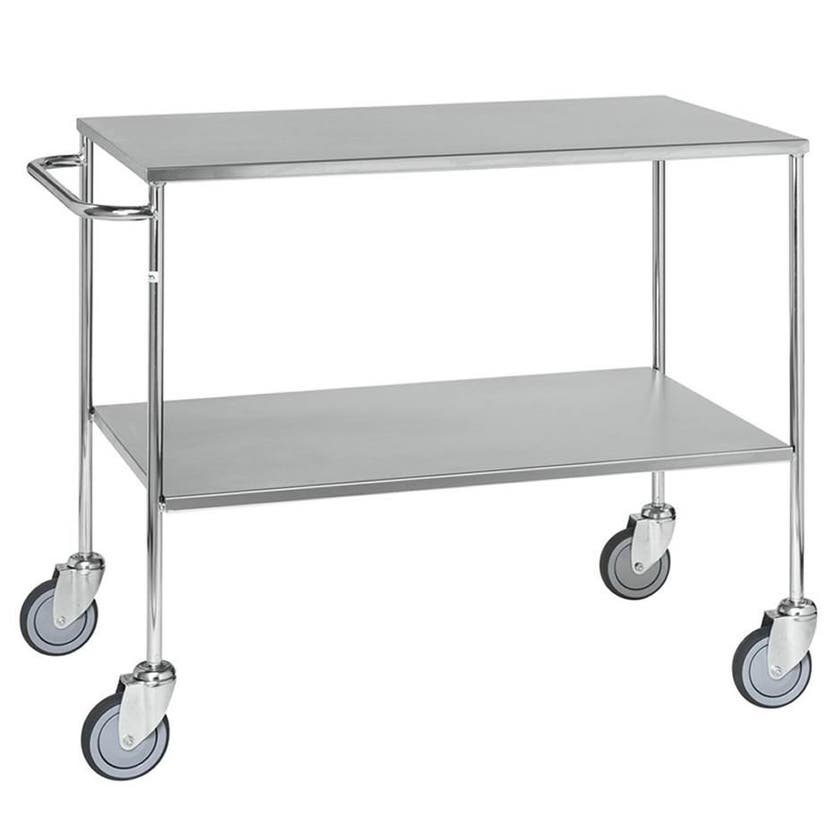 Bordsvagn i helsvetsad stålrörskonstruktion med hyllplan av spånskiva klädd i 1 mm rostfri plåt. Handtag på ena kortsidan. Mått L:1000 x B:580 x H:870 mm. Avstånd mellan hyllplan 450 mm. 4 länkhjul 125 mm. Kapacitet 200 kg. Vikt 34,5 kg. Önskar du förse din bordsvagn med broms på ena hjulparet så är det valbart i rullisten nedan.