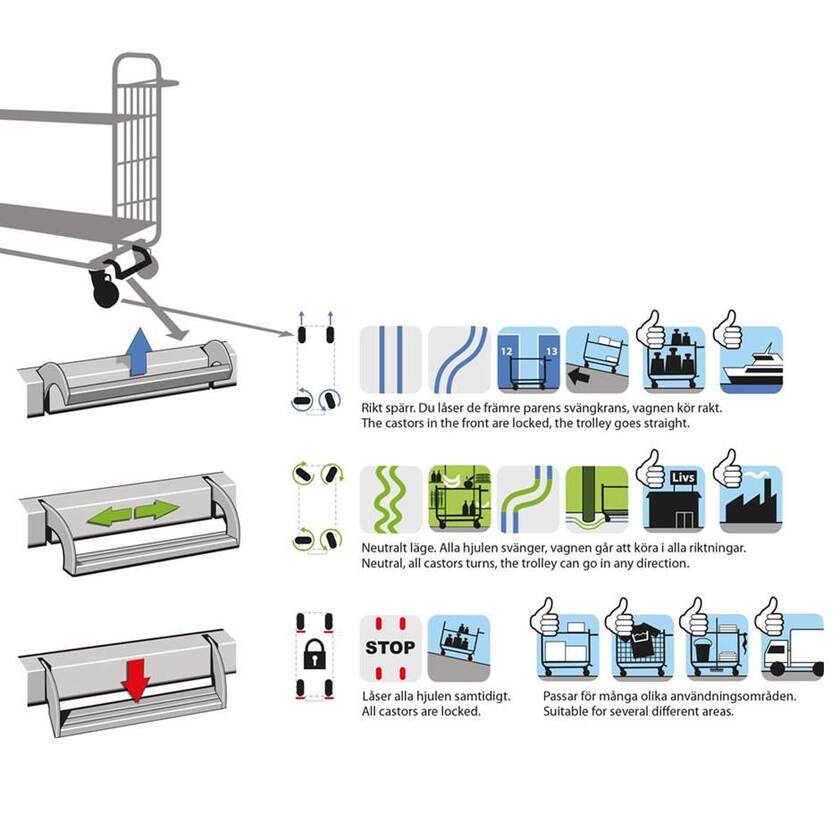 * Neutralt läge: Alla hjul är svängbara och plockvagnen går att köra i alla riktningar. Bra i butiker och trånga lokaler med många hinder som ska passeras.