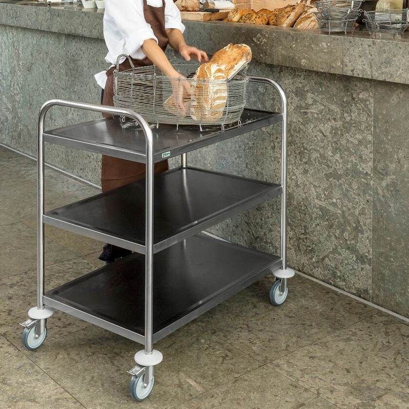 Vagn Mark, rostfri, 3 plan, 910x590x940 mm, kap. 100 kg, broms