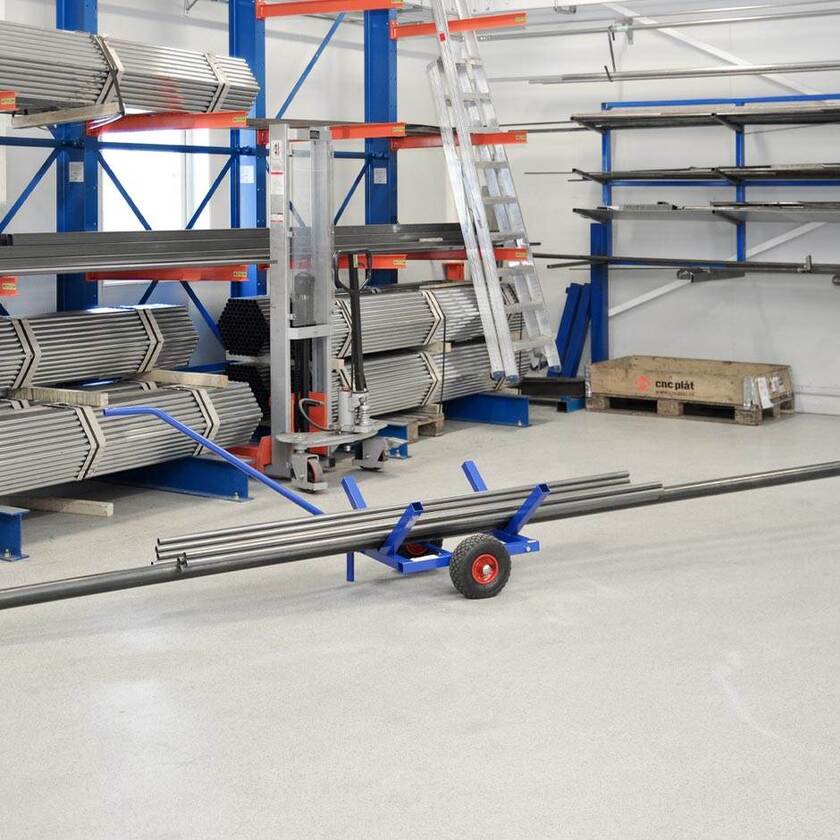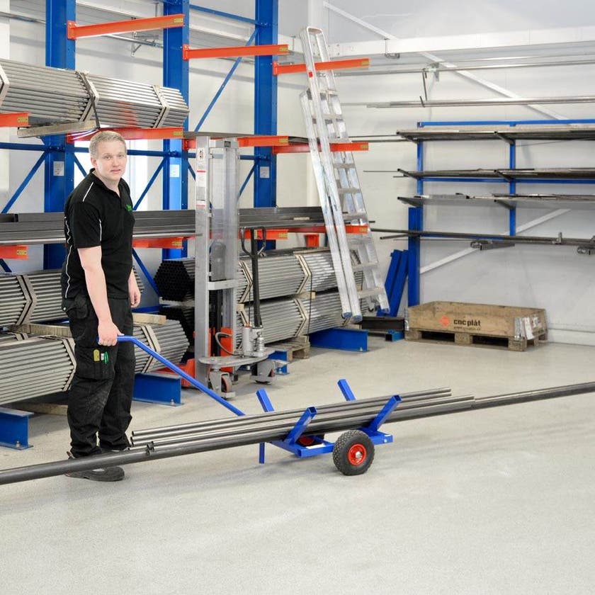 Långgodsvagn för lättare långgods. Längd 600 mm, längd med handtag 1600 mm. Kapacitet 200 kg. Med handtaget monterat vid sidan av långgodsvagnen så är det gott om plats även för de större / längre rören. En manuell långgodsvagn kan vara den perfekta lösningen i lagermiljö för att snabbt plocka fram rör eller reglar även där en truck inte kommer till.