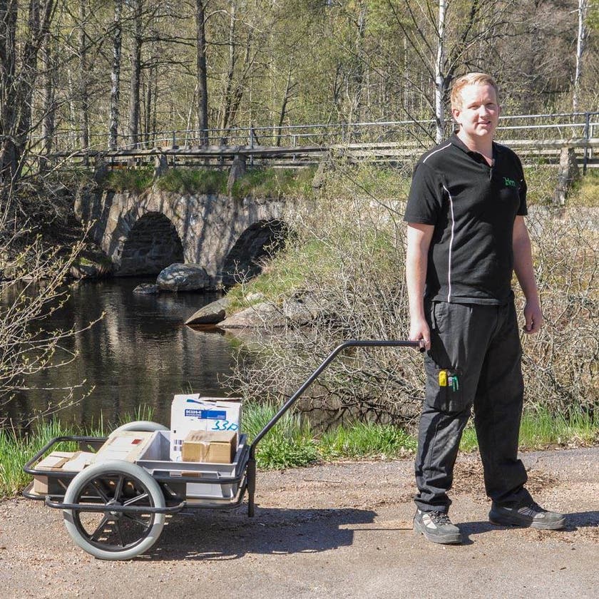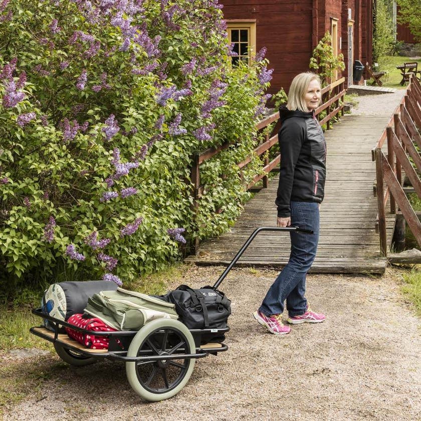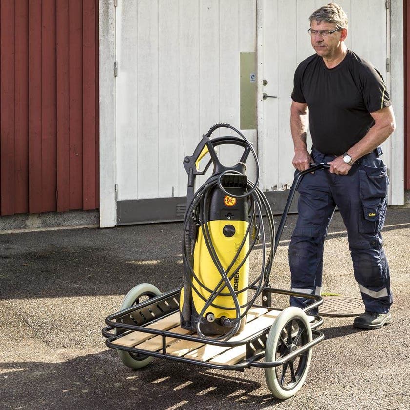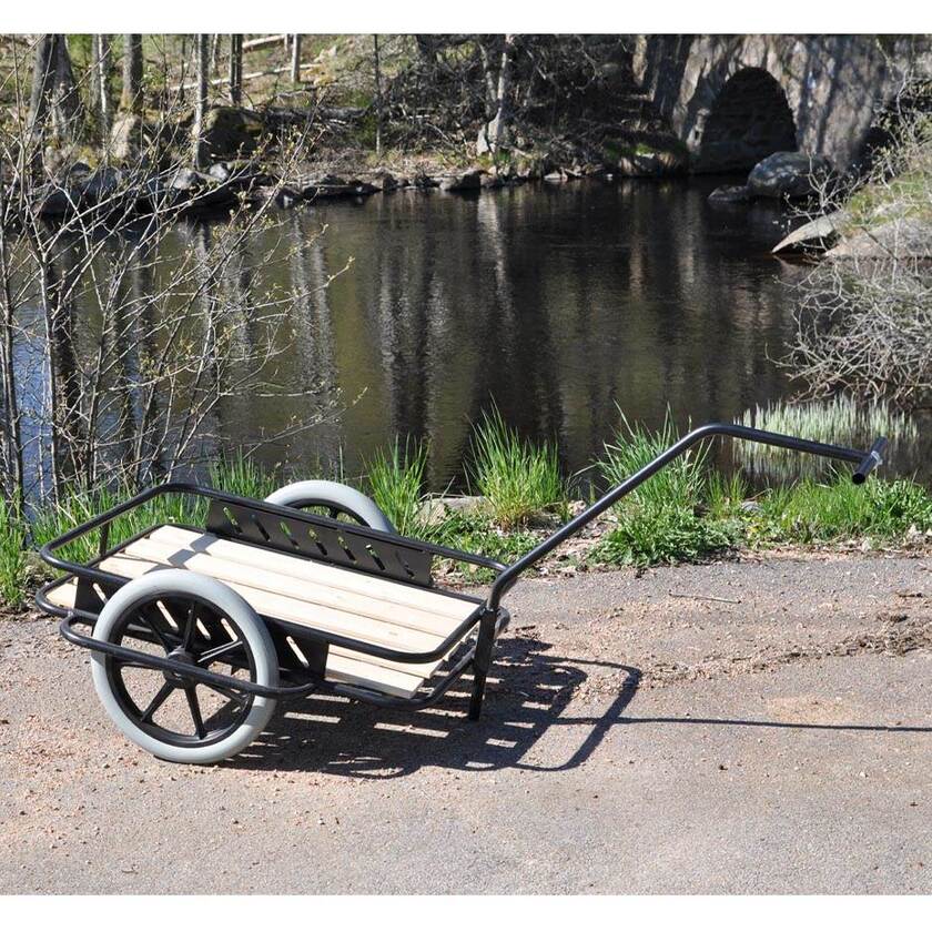 Dragkärra med träflak som är anpassat till plastbackar (1 st 800x600 eller 2 st 600x400 mm). Påfallande allround, den typen av kärra som plötsligt blir den perfekta lösningen när man behöver en smidig transportlösning. Pulverlackerat stål i svart färg. Punkteringsfria hjul Ø400 mm. Max belastning 150 kg. Levereras omonterad.