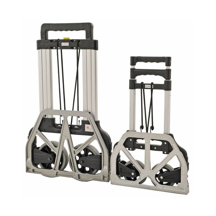 Mindre magasin- och bagagekärra i kraftig aluminiumkonstruktion. Lätt att fälla ihop för förvaring och transport. I ihopfällt läge mäter bagagekärran 390 x 55 x 675 mm. Vikt endast 3,5 kg. Perfekt att ha med sig i bilen då tillfälle för användning dyker upp. Bagagekärran klarar en belastning på 60 kg. Storlek på lastplan 385 x 230 mm. Gummihjul med plastfälg Ø125 mm.