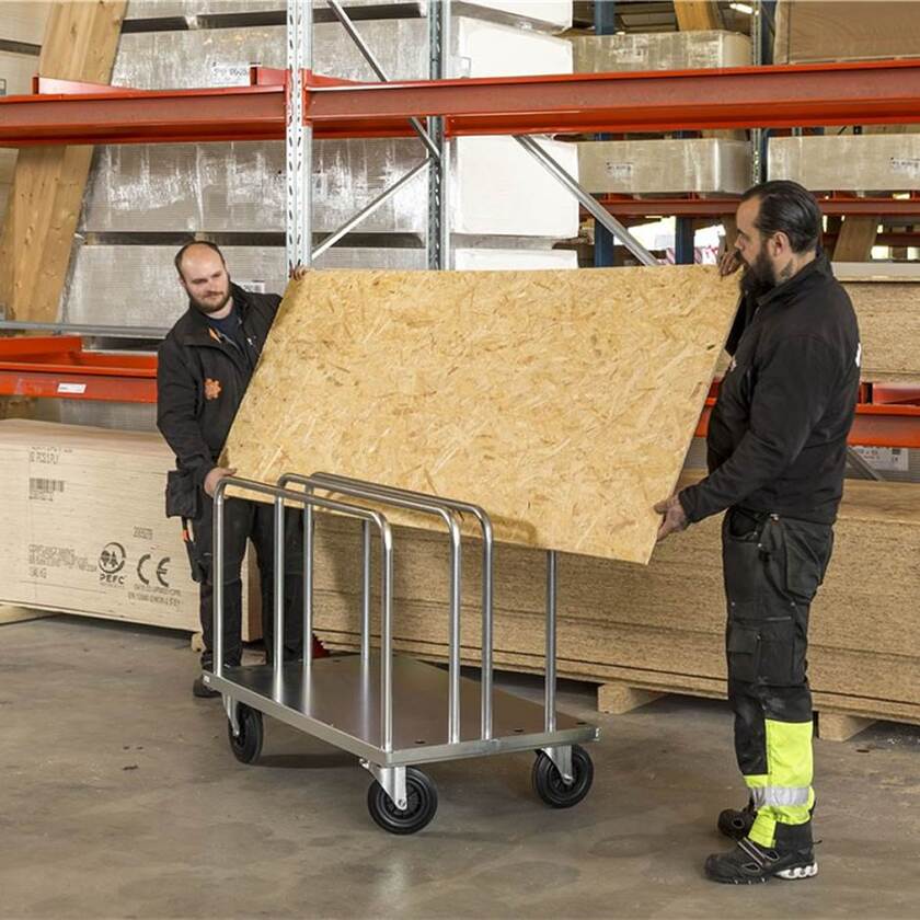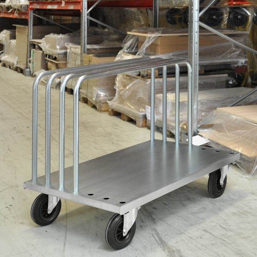 Kraftig skivvagn / skivtransportvagn i elförzinkad plåt. En skivvagn är i all sin enkelhet en ergonomisk livräddare. Få saker är väl så besvärligt som att hantera och transportera skivor utan lämpligt hjälpmedel. Mått L:1250 x B: 700 x H: 945 mm, vikt 44 kg. Flakhöjd 265 mm,. Skivvagnen är utrustad med två fasta och två svängbara hjul (200 x 50 mm). Kapacitet 500 kg. Skivvagnen levereras med två byglar, totalt finns plats för sju byglar. Avståndet mellan byglar är 77 mm.