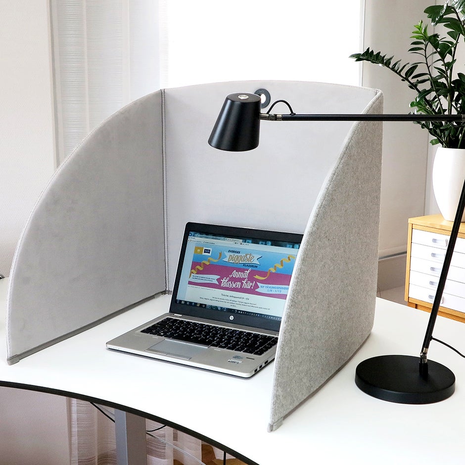 Bordskärmen är avskärmande och ljuddämpande, med en kärna av stabil, återvinningsbar kanalplast. Den är utvändigt klädd med ett grått, lätt melerat tyg med tuftad look. Invändigt är den klädd med alcantara-liknande tyg.