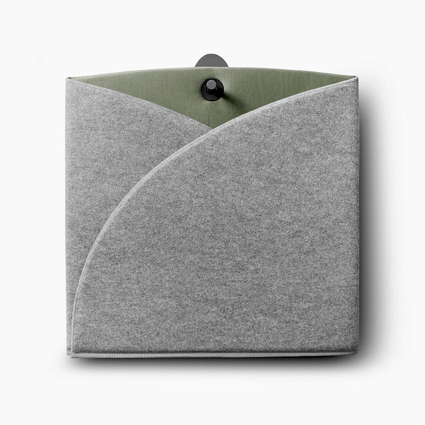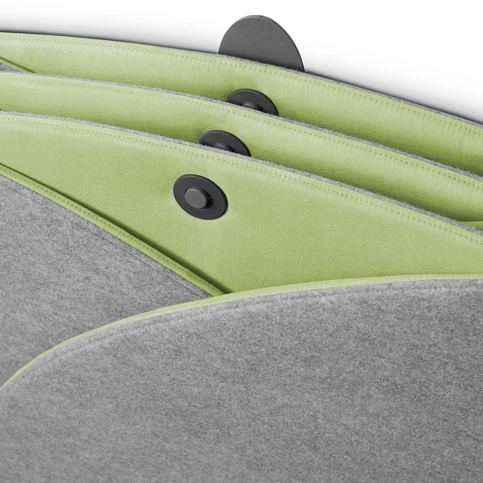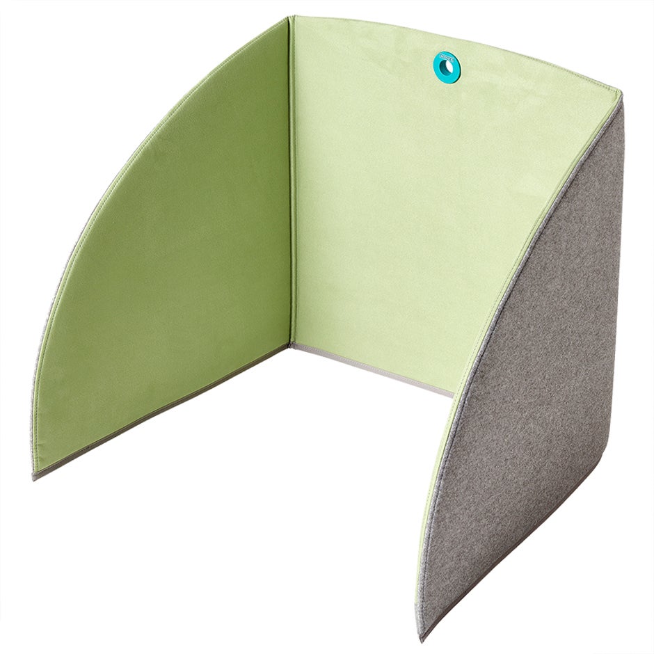 Bordskärmen är avskärmande och ljuddämpande, med en kärna av stabil, återvinningsbar kanalplast. Den är utvändigt klädd med ett grått, lätt melerat tyg med tuftad look. Invändigt är den klädd med alcantara-liknande tyg.