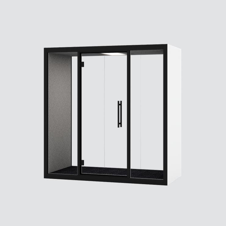Chatbox Duo, tyst rum för 2 personer, Vit utsida med grå tygbeklädd insida, inkl. bord, belysning och ventilation