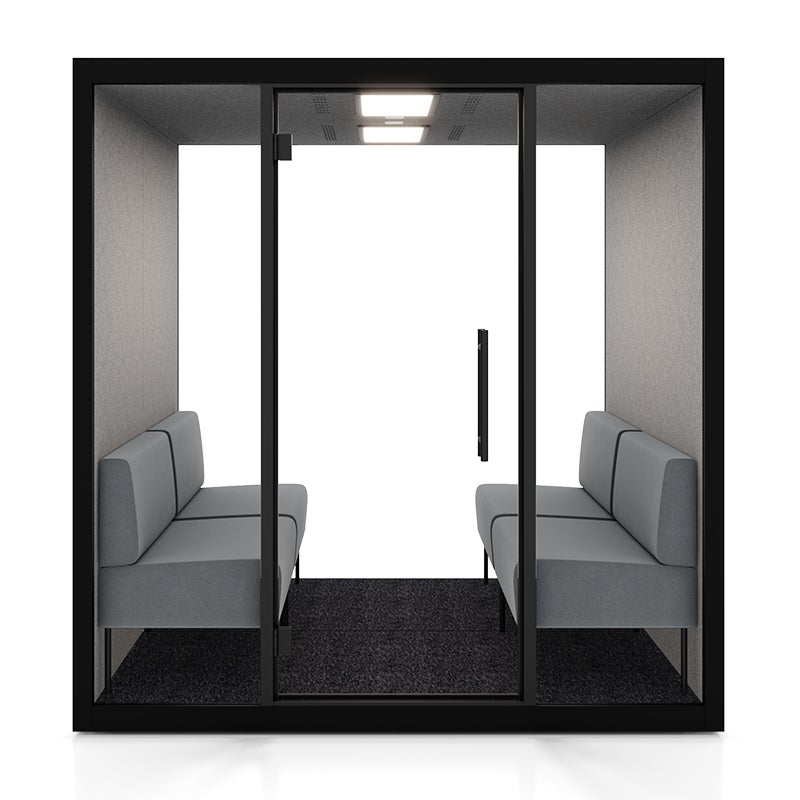Chatbox Quattro, tyst rum för 4 personer, Svart utsida med grå tygbeklädd insida, inkl. bord, belysning och ventilation