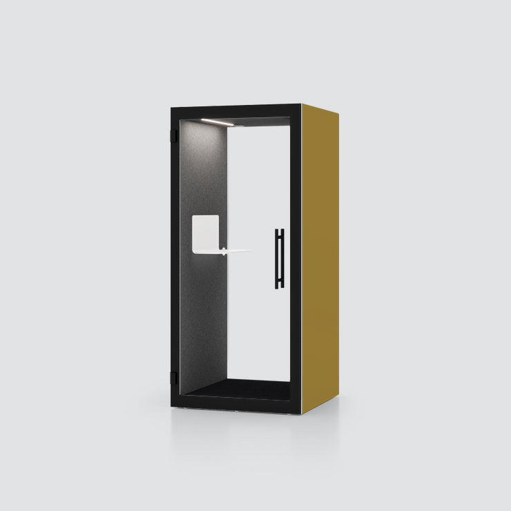 Chatbox Single, tyst rum för 1 person, Gul Mustard utsida med grå tygbeklädd insida, inkl. bord, belysning och ventilation