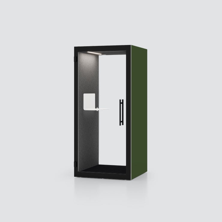 Chatbox Single, tyst rum för 1 person, Grön Evergreen utsida med grå tygbeklädd insida, inkl. bord, belysning och ventilation